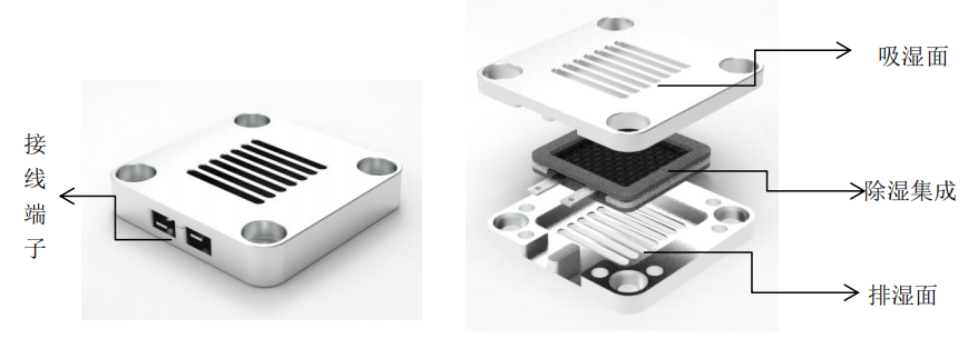 Brim®D1L02法蘭式除濕器用固體聚合物電解質(zhì)膜來(lái)電解和去除容器中的水分。 當(dāng)在具有連接至特殊的固體聚合物電解質(zhì)膜的多孔電極的除濕元件的兩端施加直流電壓時(shí),陽(yáng)極側(cè)(除濕側(cè))的水 分在除濕元件的表面上解離為氫離子(H +)和氧。氫離子移動(dòng)通過(guò)固體高分子電解質(zhì)膜并到達(dá)陰極側(cè)(放濕側(cè))。